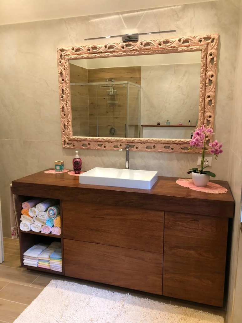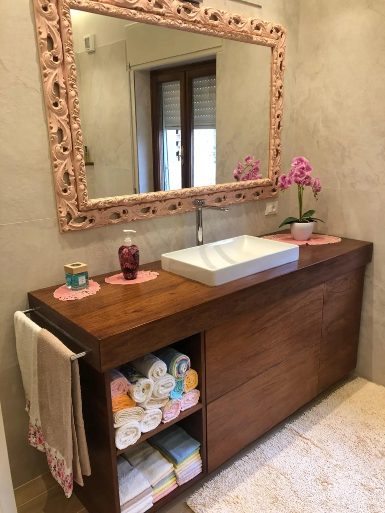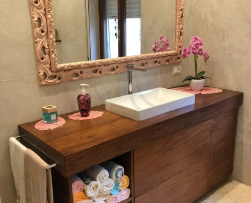Arredamento su misura per bagno, mobile di design in legno scuro con specchio artigianale visto frontalmente.