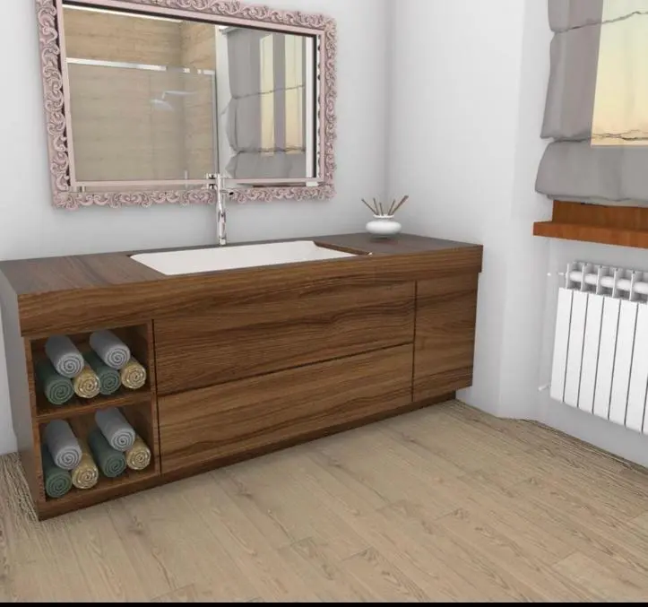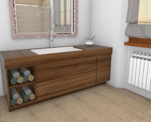 Rendering 3D di arredamento su misura per bagno con mobile e specchio di design.